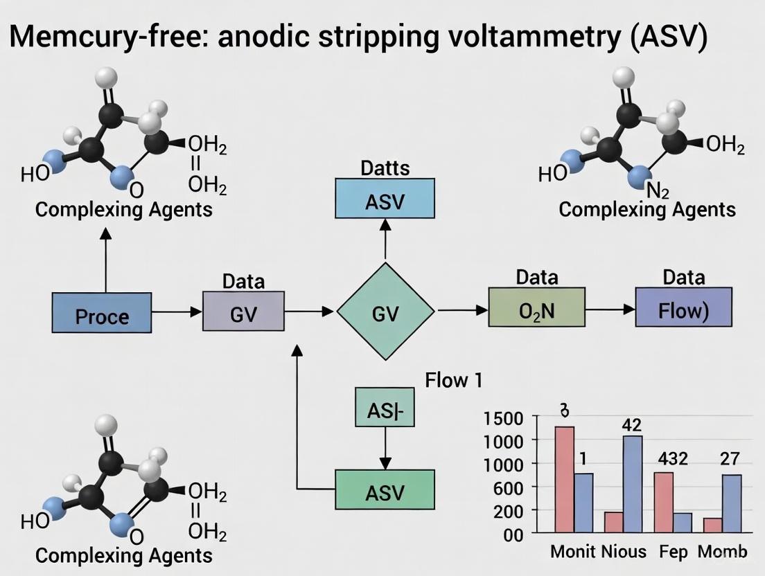 The integration of advanced complexing agents with mercury-free electrodes has fundamentally transformed ASV into a highly selective, reliable, and environmentally friendly analytical technique. By carefully designing ligand-modified surfaces, researchers can achieve the sensitivity and selectivity required for challenging applications in drug development, such as monitoring metal impurities in pharmaceuticals, and in clinical diagnostics. Future directions should focus on the development of multi-functional ligands for simultaneous metal detection, the creation of more robust and disposable sensor platforms for point-of-care testing, and the deeper integration of these sensors with automated sampling systems. This progress will further solidify the role of mercury-free ASV as an indispensable tool for precise metal analysis in both the laboratory and the field.